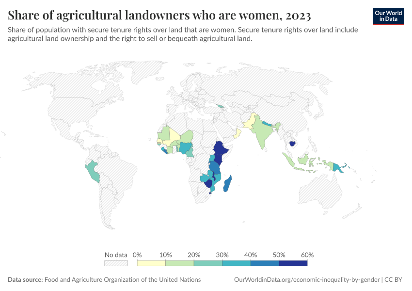 “Data Page: Share of agricultural landowners who are women”. Our World in Data (2026). Data adapted from Food and Agriculture Organization of the United Nations. Retrieved from https://enhance-catalog-improvements.owid.pages.dev:8789/20260105-133053/grapher/share-of-agricultural-land-owners-that-are-women.html [online resource] (archived on January 5, 2026).How to cite this data