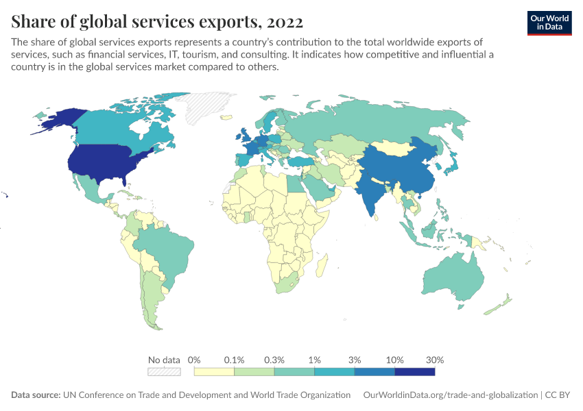 “Data Page: Share of global services exports”. Our World in Data (2026). Data adapted from UN Conference on Trade and Development and World Trade Organization. Retrieved from https://enhance-catalog-improvements.owid.pages.dev:8789/20260130-180113/grapher/share-of-global-services-exports.html [online resource] (archived on January 30, 2026).How to cite this data