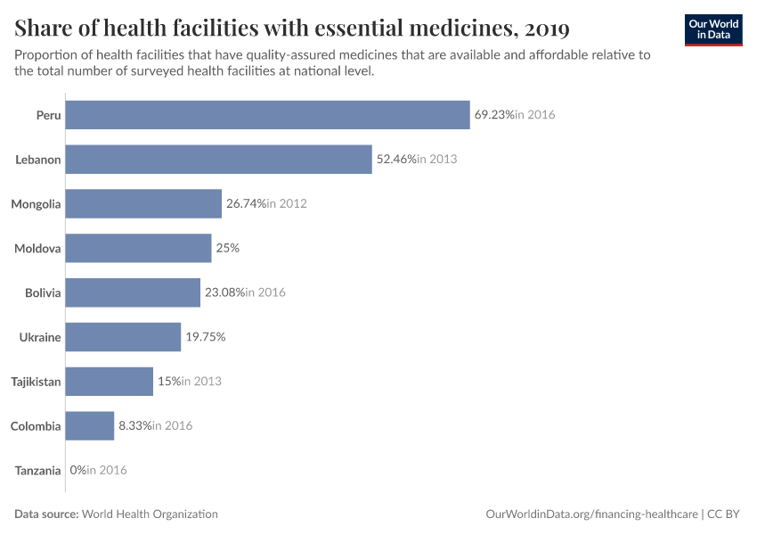 “Data Page: Share of health facilities with essential medicines”. Our World in Data (2026). Data adapted from World Health Organization. Retrieved from https://enhance-catalog-improvements.owid.pages.dev:8789/20251204-144539/grapher/share-of-health-facilities-with-essential-medicines.html [online resource] (archived on December 4, 2025).How to cite this data