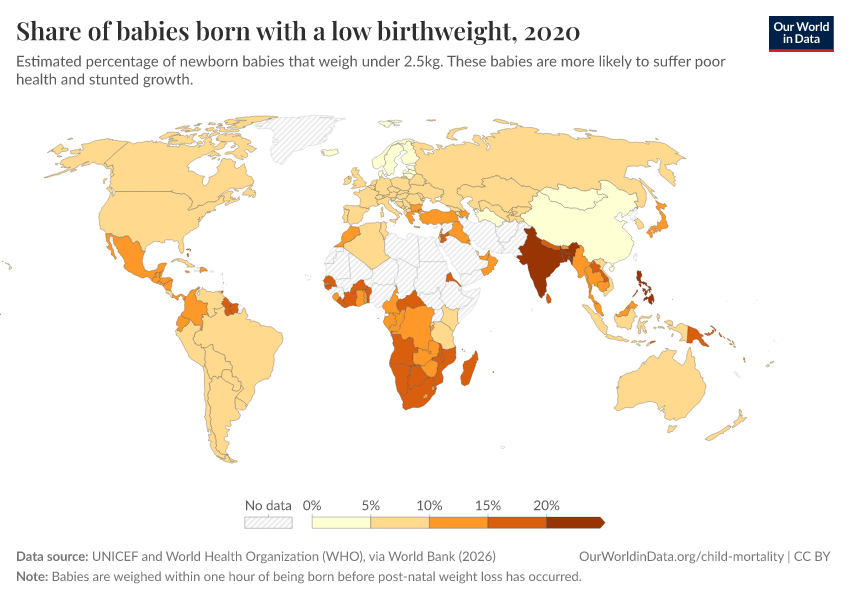 “Data Page: Share of babies born with a low birthweight”. Our World in Data (2026). Data adapted from UNICEF and World Health Organization (WHO), via World Bank. Retrieved from https://enhance-catalog-improvements.owid.pages.dev:8789/20260202-181317/grapher/share-of-low-birthweight-babies-born.html [online resource] (archived on February 2, 2026).How to cite this data