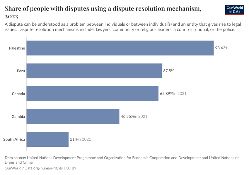 United Nations Development Programme and Organization for Economic Cooperation and Development and United Nations on Drugs and Crime – processed by Our World in Data. “Share of people with disputes using a dispute resolution mechanism” [dataset]. United Nations Development Programme and Organization for Economic Cooperation and Development and United Nations on Drugs and Crime, “Data from multiple sources” [original data]. Retrieved February 24, 2026 from https://enhance-catalog-improvements.owid.pages.dev:8789/20251204-144539/grapher/share-of-people-with-disputes-using-a-dispute-resolution-mechanism.html (archived on December 4, 2025).