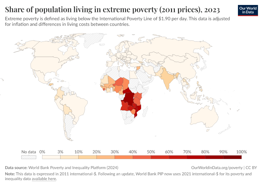 World Bank Poverty and Inequality Platform (2024) – with major processing by Our World in Data. “Share of population living in extreme poverty (2011 prices) – World Bank” [dataset]. World Bank Poverty and Inequality Platform, “World Bank Poverty and Inequality Platform (PIP) 20240627_2017, 20240627_2011” [original data]. Retrieved February 24, 2026 from https://enhance-catalog-improvements.owid.pages.dev:8789/20251022-091218/grapher/share-of-population-in-extreme-poverty-2011-ppp.html (archived on October 22, 2025).