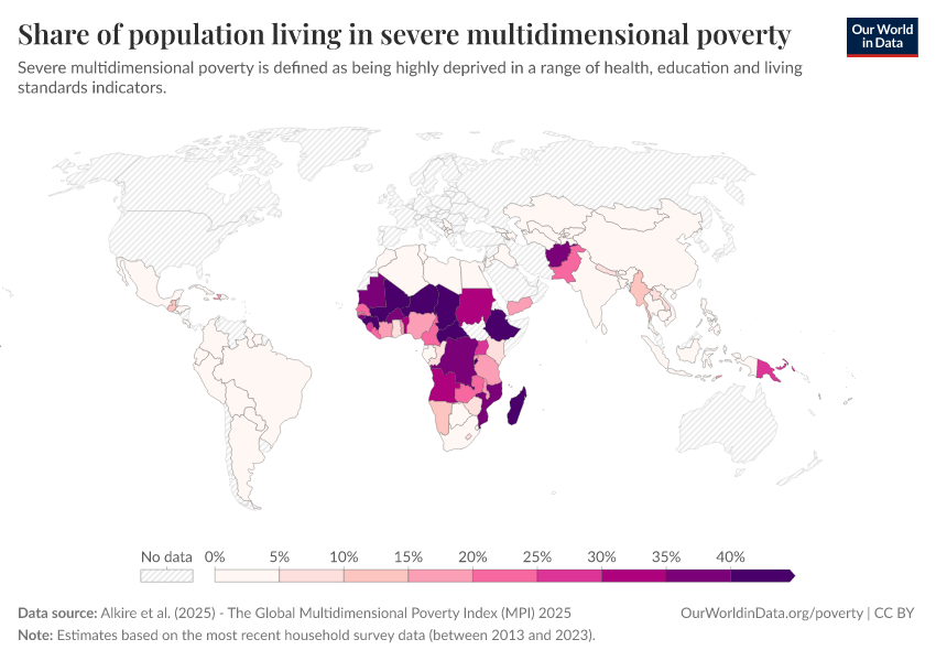 “Data Page: Share of population living in severe multidimensional poverty”, part of the following publication: Joe Hasell, Bertha Rohenkohl, Pablo Arriagada, Esteban Ortiz-Ospina, and Max Roser (2022) - “Poverty”. Data adapted from Alkire et al.. Retrieved from https://enhance-catalog-improvements.owid.pages.dev:8789/20251229-175603/grapher/share-of-population-in-severe-multidimensional-poverty.html [online resource] (archived on December 29, 2025).How to cite this data