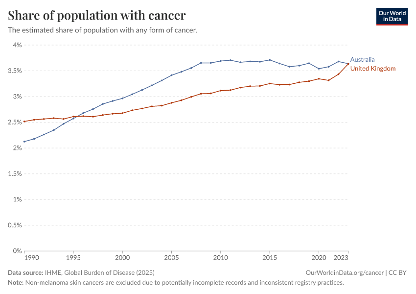 “Data Page: Share of population with cancer”, part of the following publication: Esteban Ortiz-Ospina and Max Roser (2016) - “Global Health”. Data adapted from IHME, Global Burden of Disease. Retrieved from https://enhance-catalog-improvements.owid.pages.dev:8789/20260212-172859/grapher/share-of-population-with-cancer-crude.html [online resource] (archived on February 12, 2026).