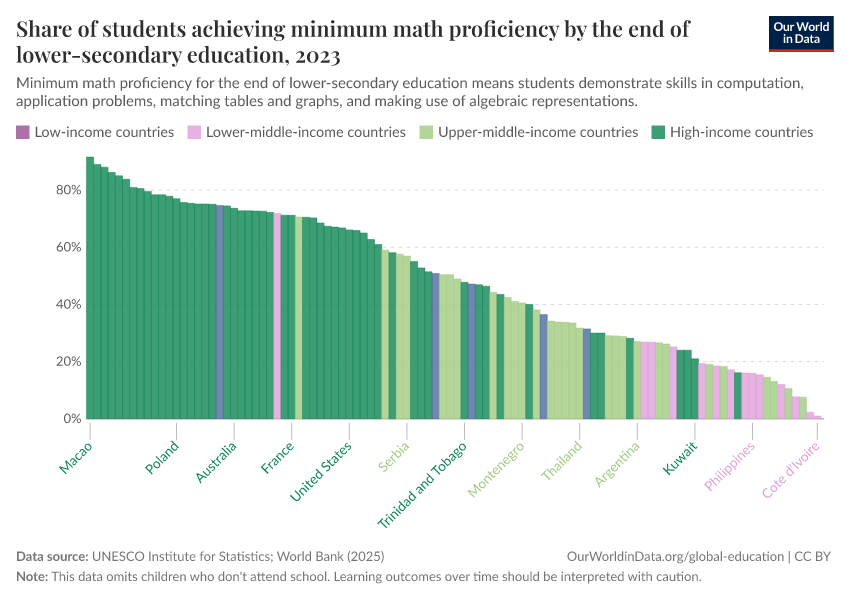 “Data Page: Share of students achieving minimum math proficiency by the end of lower-secondary education”. Our World in Data (2026). Data adapted from UNESCO Institute for Statistics. Retrieved from https://enhance-catalog-improvements.owid.pages.dev:8789/20260130-180113/grapher/share-of-students-at-end-of-lower-secondary-education-achieving-minimum-math-proficiency.html [online resource] (archived on January 30, 2026).How to cite this data