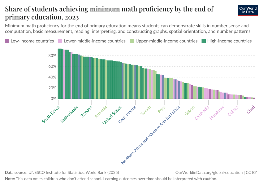 “Data Page: Share of students achieving minimum math proficiency by the end of primary education”. Our World in Data (2026). Data adapted from UNESCO Institute for Statistics. Retrieved from https://enhance-catalog-improvements.owid.pages.dev:8789/20260130-180113/grapher/share-of-students-at-end-of-primary-education-achieving-minimum-math-proficiency.html [online resource] (archived on January 30, 2026).How to cite this data