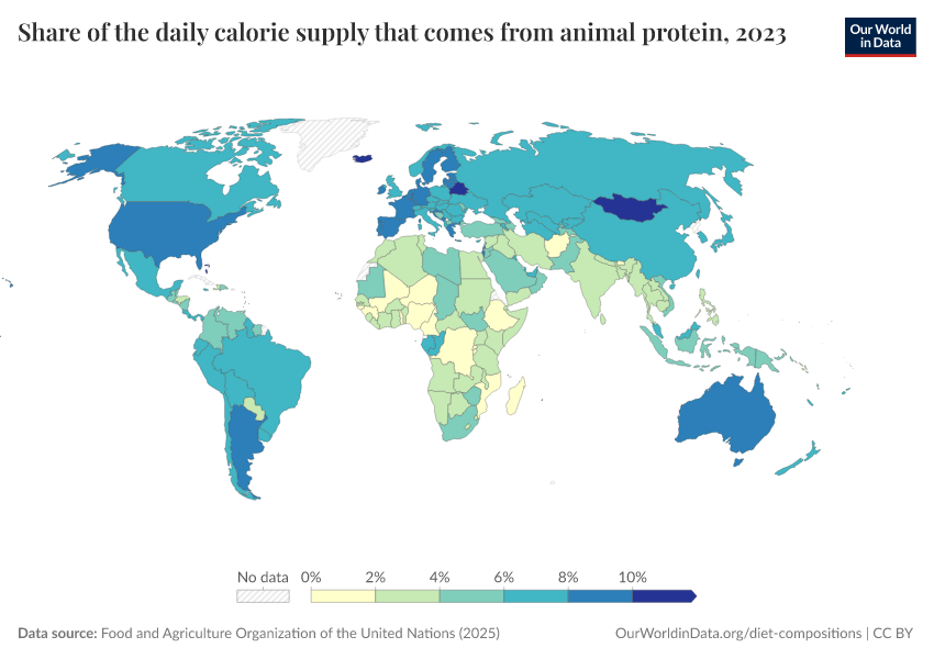 “Data Page: Share of the daily calorie supply that comes from animal protein”, part of the following publication: Hannah Ritchie, Pablo Rosado, and Max Roser (2023) - “Agricultural Production”. Data adapted from Food and Agriculture Organization of the United Nations. Retrieved from https://enhance-catalog-improvements.owid.pages.dev:8789/20260116-144923/grapher/share-of-the-daily-calorie-supply-that-comes-from-animal-protein.html [online resource] (archived on January 16, 2026).How to cite this data
