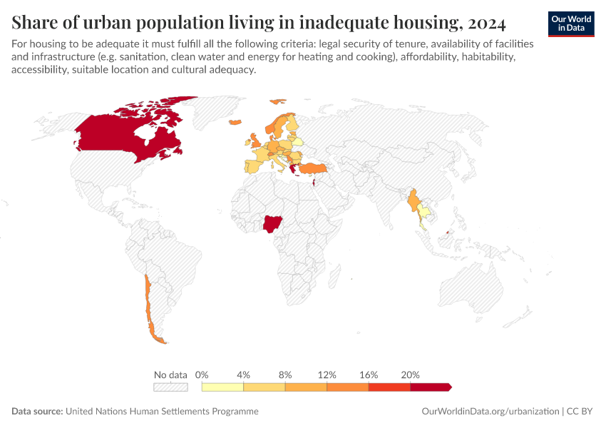 “Data Page: Share of urban population living in inadequate housing”. Our World in Data (2026). Data adapted from United Nations Human Settlements Programme. Retrieved from https://enhance-catalog-improvements.owid.pages.dev:8789/20251120-211749/grapher/share-of-urban-population-living-in-inadequate-housing.html [online resource] (archived on November 20, 2025).How to cite this data