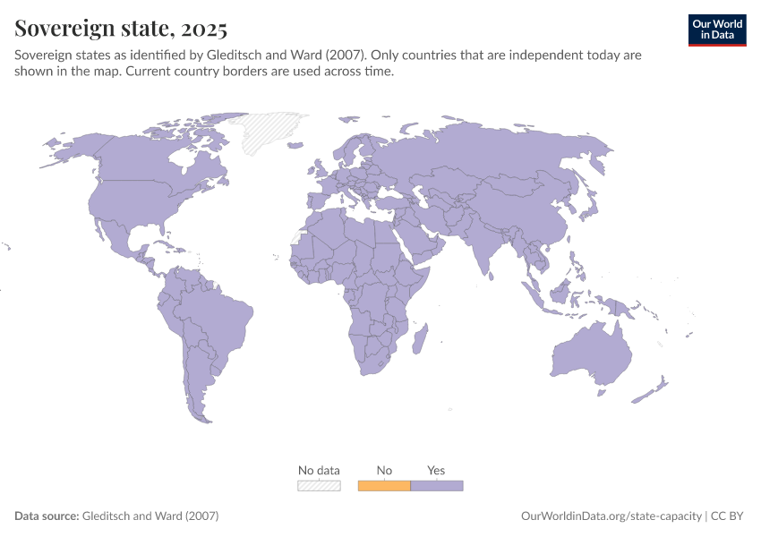 “Data Page: Sovereign state”, part of the following publication: Bastian Herre and Pablo Arriagada (2023) - “State Capacity”. Data adapted from Gleditsch and Ward. Retrieved from https://enhance-catalog-improvements.owid.pages.dev:8789/20260119-070102/grapher/sovereign-state-gleditsch-ward.html [online resource] (archived on January 19, 2026).How to cite this data