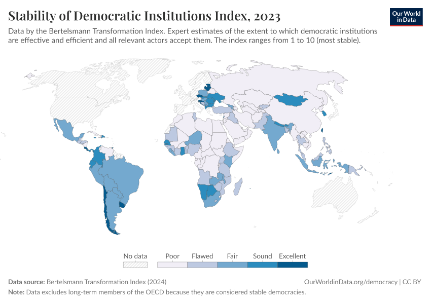 Bertelsmann Transformation Index (2024) – processed by Our World in Data. “Stability of Democratic Institutions Index” [dataset]. Bertelsmann Transformation Index, “Bertelsmann Transformation Index, Scores” [original data]. Retrieved February 24, 2026 from https://enhance-catalog-improvements.owid.pages.dev:8789/20260105-133053/grapher/stability-democratic-institutions-index-bti.html (archived on January 5, 2026).