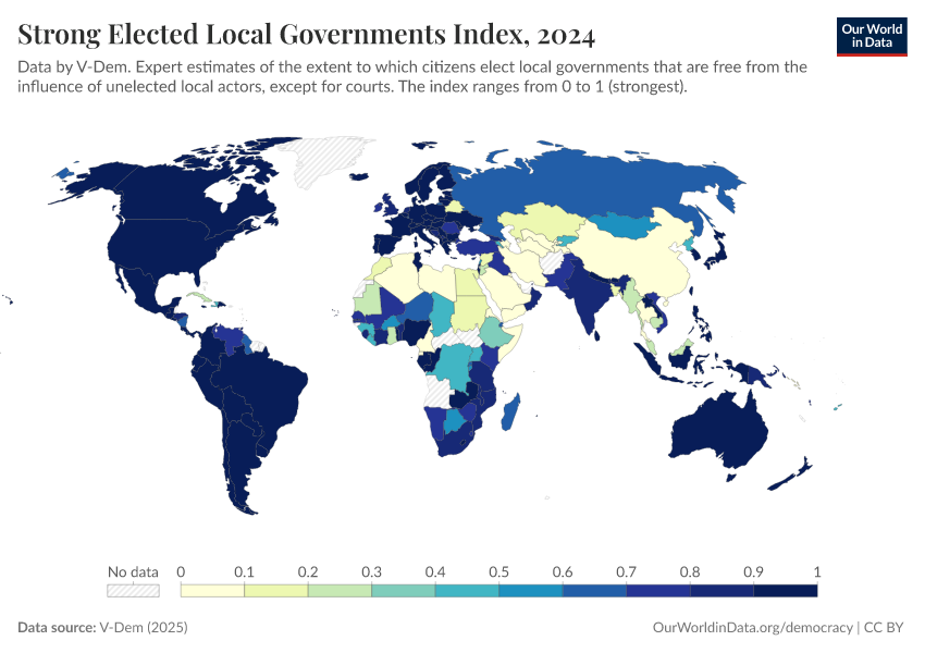 “Data Page: Elected local governments”, part of the following publication: Bastian Herre, Lucas Rodés-Guirao, and Esteban Ortiz-Ospina (2013) - “Democracy”. Data adapted from V-Dem. Retrieved from https://enhance-catalog-improvements.owid.pages.dev:8789/20260119-070102/grapher/strong-elected-local-governments-index.html [online resource] (archived on January 19, 2026).How to cite this data