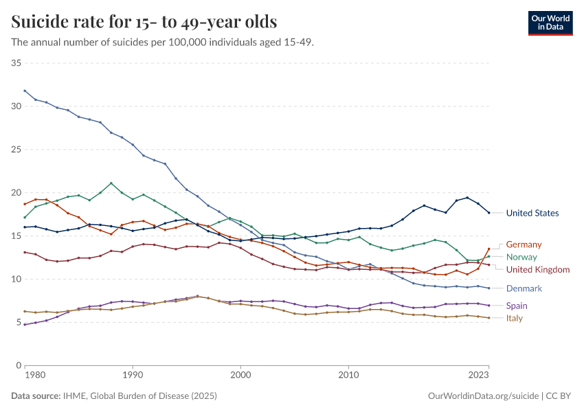 “Data Page: Suicide rate for 15- to 49-year olds”, part of the following publication: Esteban Ortiz-Ospina and Max Roser (2016) - “Global Health”. Data adapted from IHME, Global Burden of Disease. Retrieved from https://enhance-catalog-improvements.owid.pages.dev:8789/20260211-174736/grapher/suicide-rate-for-15--to-49-year-olds.html [online resource] (archived on February 11, 2026).How to cite this data