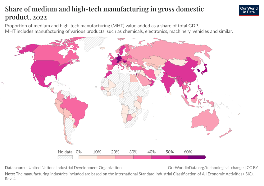 “Data Page: Share of medium and high-tech manufacturing in gross domestic product”. Our World in Data (2026). Data adapted from United Nations Industrial Development Organization. Retrieved from https://enhance-catalog-improvements.owid.pages.dev:8789/20260130-180113/grapher/total-manufacturing-value-added-from-high-tech.html [online resource] (archived on January 30, 2026).How to cite this data