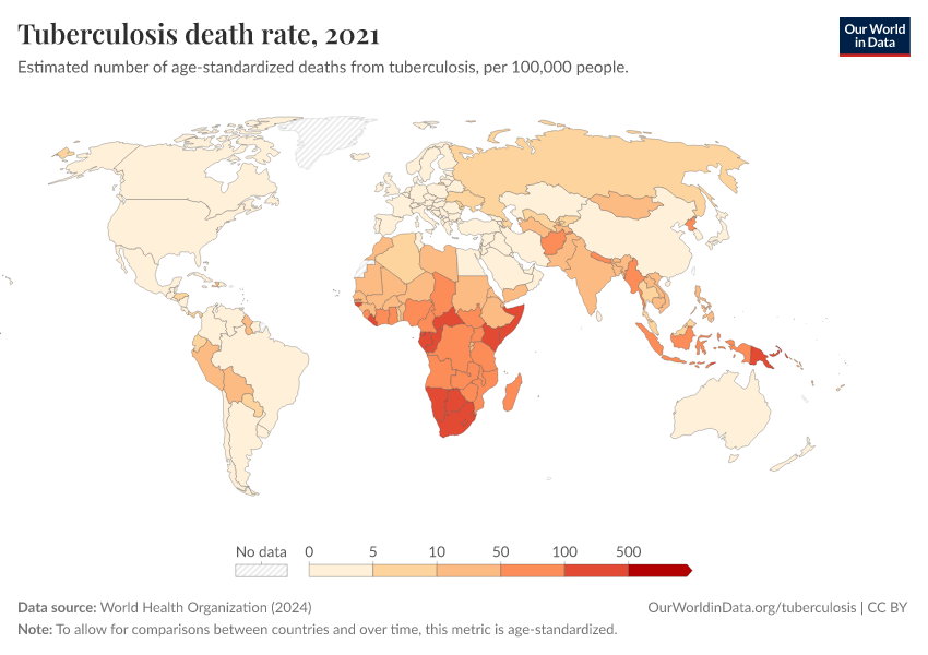 World Health Organization (2024) – with major processing by Our World in Data. “Tuberculosis death rate” [dataset]. World Health Organization, “Global Health Estimates” [original data]. Retrieved February 24, 2026 from https://enhance-catalog-improvements.owid.pages.dev:8789/20250909-093708/grapher/tuberculosis-death-rate-age-standardized.html (archived on September 9, 2025).