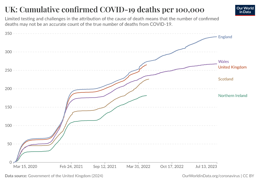 Government of the United Kingdom (2024) – with minor processing by Our World in Data. “UK: Cumulative confirmed COVID-19 deaths per 100,000” [dataset]. Government of the United Kingdom, “UKHSA data dashboard” [original data]. Retrieved February 24, 2026 from https://enhance-catalog-improvements.owid.pages.dev:8789/20250909-093708/grapher/uk-cumulative-covid-deaths-rate.html (archived on September 9, 2025).