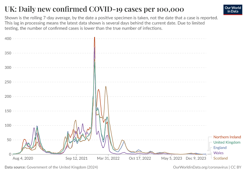 Government of the United Kingdom (2024) – with minor processing by Our World in Data. “UK: Daily new confirmed COVID-19 cases per 100,000” [dataset]. Government of the United Kingdom, “UKHSA data dashboard” [original data]. Retrieved February 24, 2026 from https://enhance-catalog-improvements.owid.pages.dev:8789/20250909-093708/grapher/uk-daily-covid-cases-7day-average.html (archived on September 9, 2025).