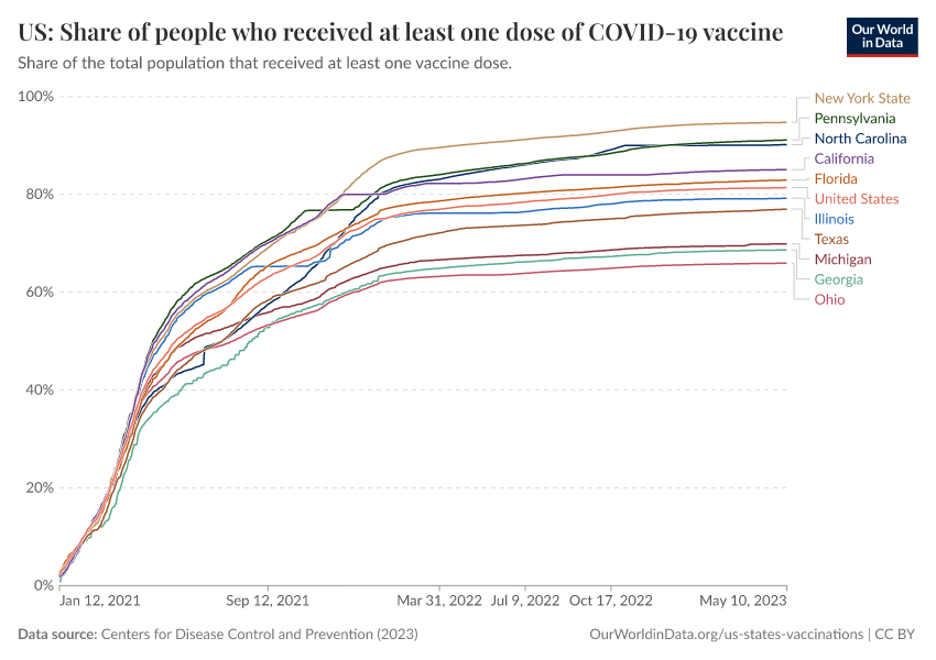 “Data Page: US: Share of people who received at least one dose of COVID-19 vaccine”, part of the following publication: Edouard Mathieu, Hannah Ritchie, Lucas Rodés-Guirao, Cameron Appel, Daniel Gavrilov, Charlie Giattino, Joe Hasell, Bobbie Macdonald, Saloni Dattani, Diana Beltekian, Esteban Ortiz-Ospina, and Max Roser (2020) - “COVID-19 Pandemic”. Data adapted from Centers for Disease Control and Prevention. Retrieved from https://enhance-catalog-improvements.owid.pages.dev:8789/20250909-093708/grapher/us-covid-19-share-people-vaccinated.html [online resource] (archived on September 9, 2025).How to cite this data