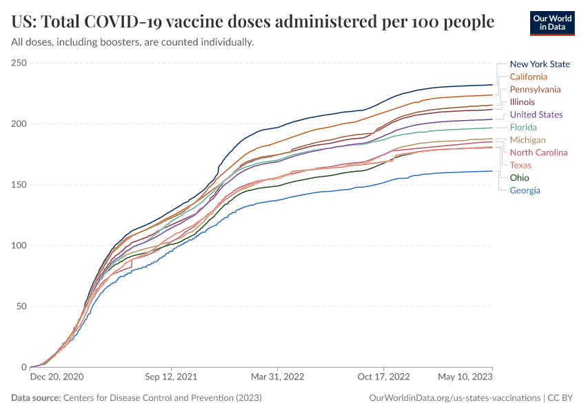 “Data Page: US: Total COVID-19 vaccine doses administered per 100 people”, part of the following publication: Edouard Mathieu, Hannah Ritchie, Lucas Rodés-Guirao, Cameron Appel, Daniel Gavrilov, Charlie Giattino, Joe Hasell, Bobbie Macdonald, Saloni Dattani, Diana Beltekian, Esteban Ortiz-Ospina, and Max Roser (2020) - “COVID-19 Pandemic”. Data adapted from Centers for Disease Control and Prevention. Retrieved from https://enhance-catalog-improvements.owid.pages.dev:8789/20250909-093708/grapher/us-state-covid-vaccines-per-100.html [online resource] (archived on September 9, 2025).How to cite this data