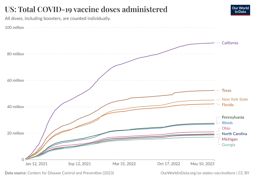 “Data Page: US: Total COVID-19 vaccine doses administered”, part of the following publication: Edouard Mathieu, Hannah Ritchie, Lucas Rodés-Guirao, Cameron Appel, Daniel Gavrilov, Charlie Giattino, Joe Hasell, Bobbie Macdonald, Saloni Dattani, Diana Beltekian, Esteban Ortiz-Ospina, and Max Roser (2020) - “COVID-19 Pandemic”. Data adapted from Centers for Disease Control and Prevention. Retrieved from https://enhance-catalog-improvements.owid.pages.dev:8789/20250909-093708/grapher/us-total-covid-19-vaccine-doses-administered.html [online resource] (archived on September 9, 2025).How to cite this data