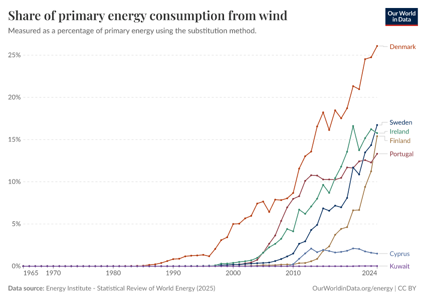 Energy Institute - Statistical Review of World Energy (2025) – with major processing by Our World in Data. “Share of primary energy consumption that comes from wind power – Using the substitution method” [dataset]. Energy Institute, “Statistical Review of World Energy” [original data]. Retrieved February 24, 2026 from https://enhance-catalog-improvements.owid.pages.dev:8789/20260119-070102/grapher/wind-share-energy.html (archived on January 19, 2026).