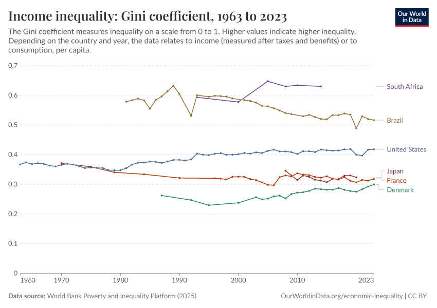 The range of incomes considered ‘middle’ and ‘high’ income countries according to the World Bank are very low relative to rich countries. High-income economies are those with a GNI per capita of $12,536 or more. The range of middle-income economies begins at a GNI per capita of $1,036. In this post I want to rely on countries like Denmark; higher income countries by any standard.