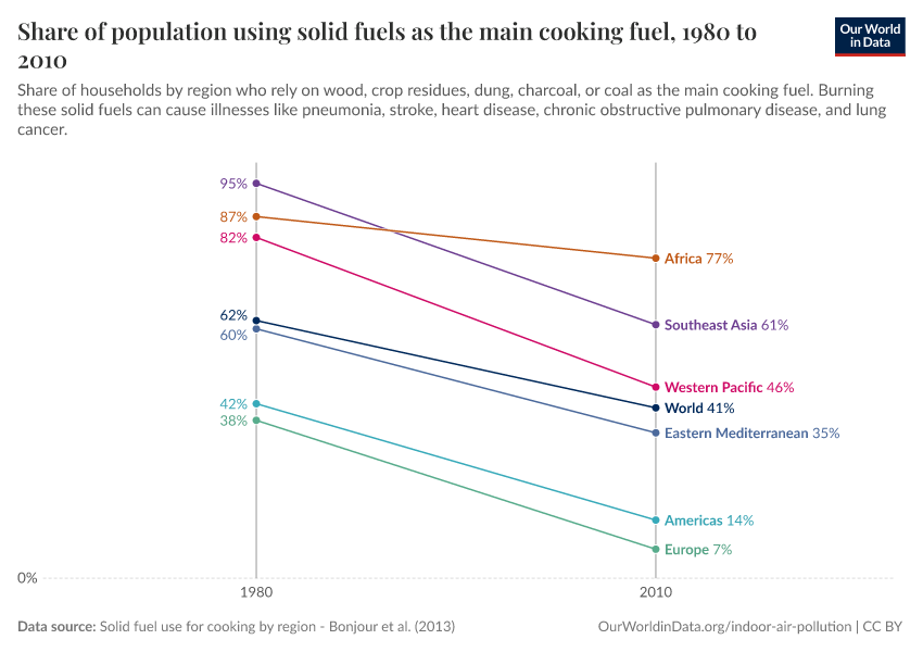 The chart shows that the world is making progress in this direction. In 1980, almost two-thirds of the world’s population used solid fuels for their cooking. Thirty years later, this is down to around 40%. The chart also shows that it is a problem associated with poverty: In richer Europe and North America, the share is much lower than in the rest of the world, and in the high-income countries of the world, the use of solid fuels is entirely a thing of the past.