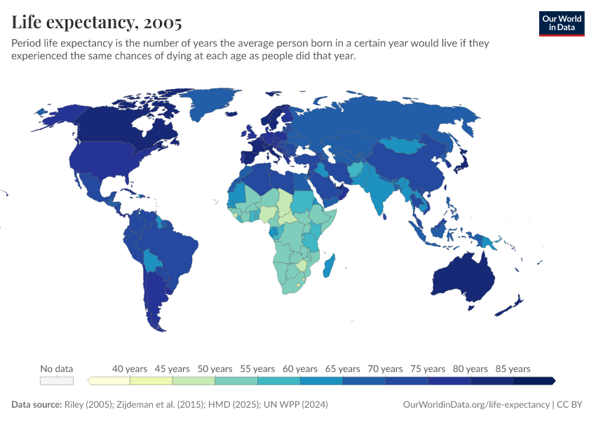 Since period life expectancy estimates are ubiquitous in research and public debate, it is helpful to use an example to flesh out the concept. Let's consider the map showing life expectancy—specifically period life expectancy—at birth in 2005. You can hover the mouse over a country to display the corresponding estimate.
