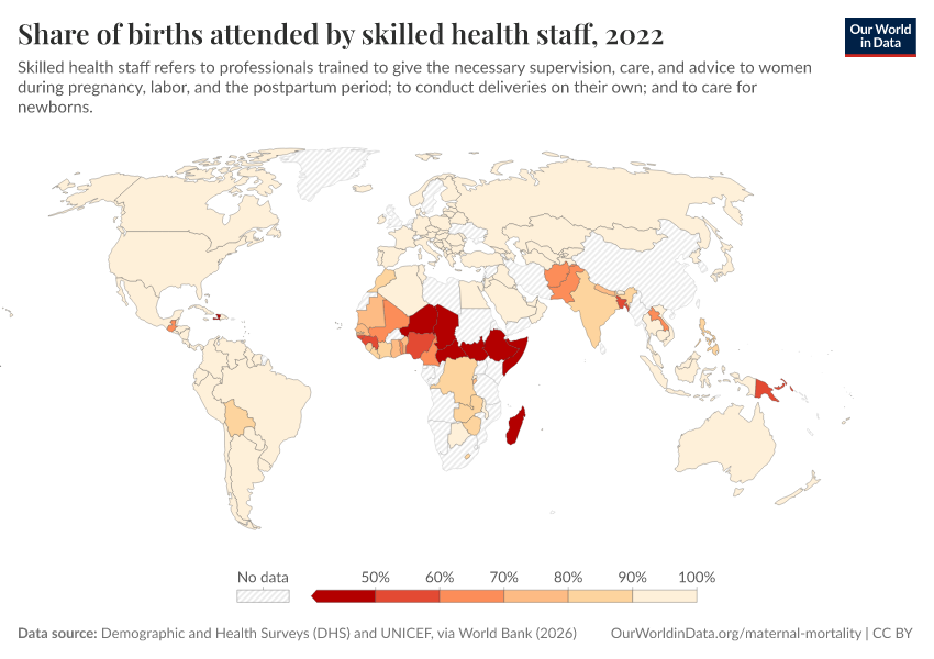In the first chart, you can see the share of births that are attended by skilled health staff. For most countries this is close to 100%. But there are still some countries where healthcare access is much lower.