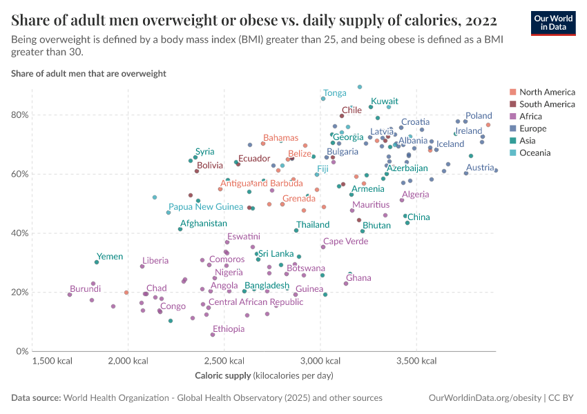 In the chart here, we see the relationship between the share of men who are overweight or obese versus the daily average supply of kilocalories per person.