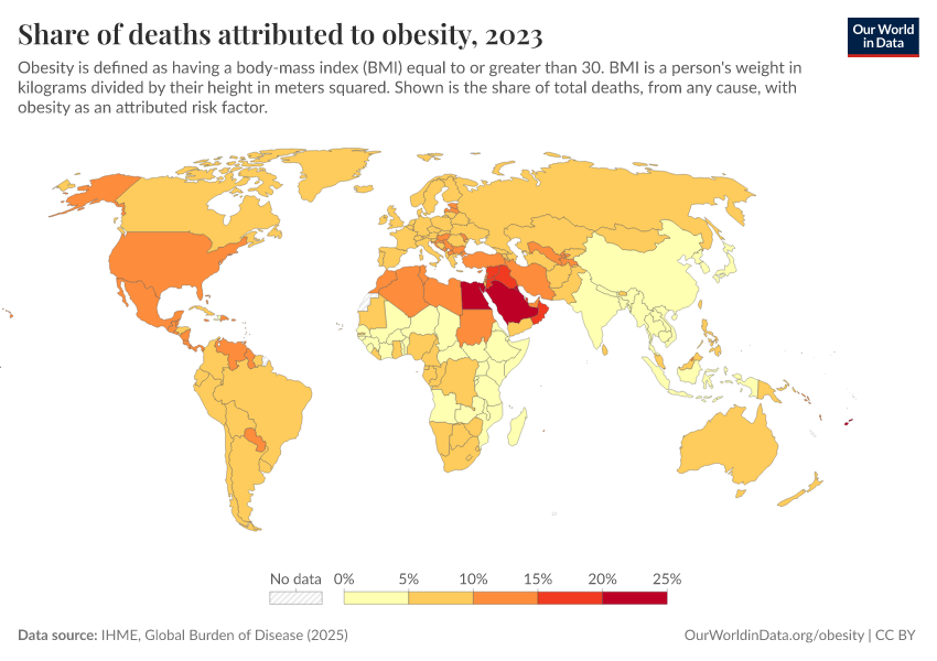 This share varies significantly across the world. In the map here we see the share of deaths attributed to obesity across countries.