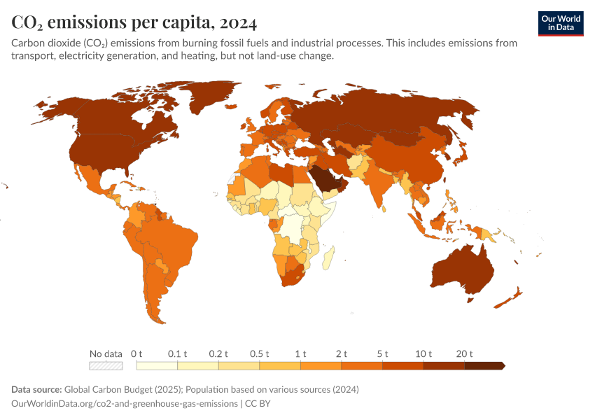 Hannah Ritchie (2019) - “Where in the world do people emit the most CO2?” Published online at OurWorldinData.org. Retrieved from: 'https://enhance-catalog-improvements.owid.pages.dev:8789/20260119-070102/per-capita-co2.html' [Online Resource] (archived on January 19, 2026).BibTeX citation