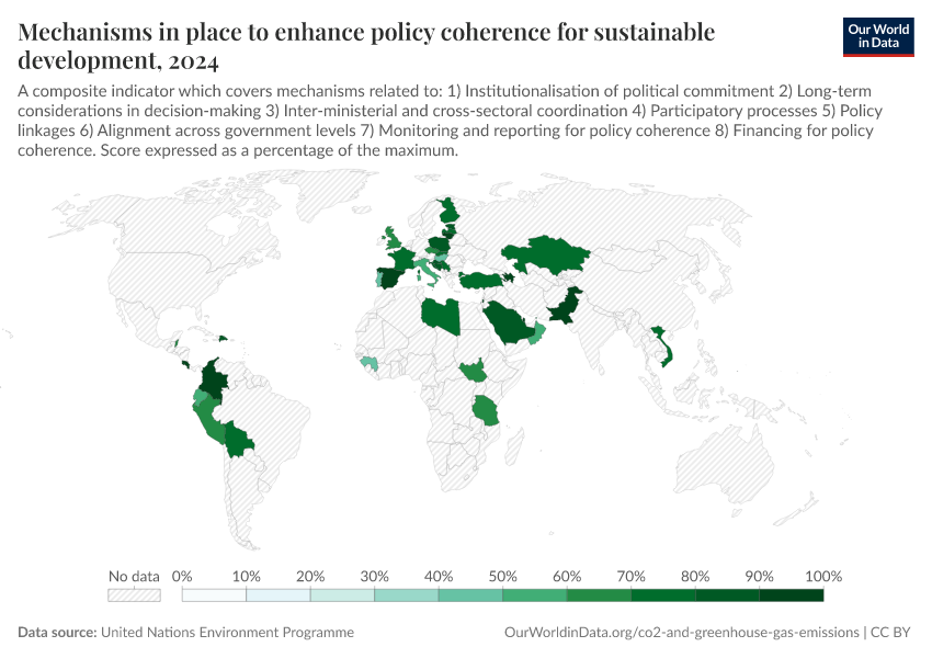 Although the indicator is defined in terms of the number of countries, in practice it is measured in terms of an implementation score for mechanisms in place to enhance policy coherence for sustainable development.