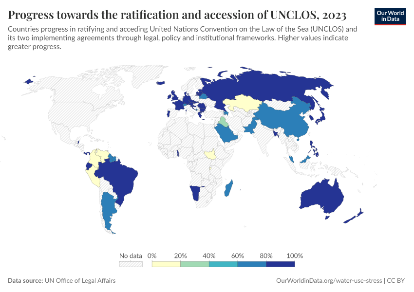 This indicator is measured as the progress countries have made towards the ratification and accession, as well as implementation of the United Nations Convention on the Law of the Sea (UNCLOS). Note that the visualization only shows data for countries that replied to the questionnaire on the ratification, accession and implementation of UNCLOS.
