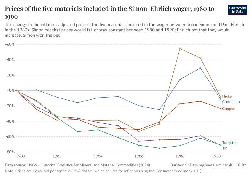 Hannah Ritchie (2025) - “Who would have won the Simon-Ehrlich bet over different decades, and what do long-term prices tell us about resource scarcity?” Published online at OurWorldinData.org. Retrieved from: 'https://enhance-catalog-improvements.owid.pages.dev:8789/20251217-135836/simon-ehrlich-bet.html' [Online Resource] (archived on December 17, 2025).BibTeX citation