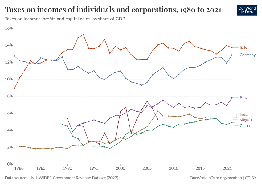 The next visualization provides an overview of revenues from income taxation (specifically taxes on incomes, profits, and capital gains) over recent decades. The estimates correspond to direct taxation of individuals and corporations and are expressed as a share of GDP.