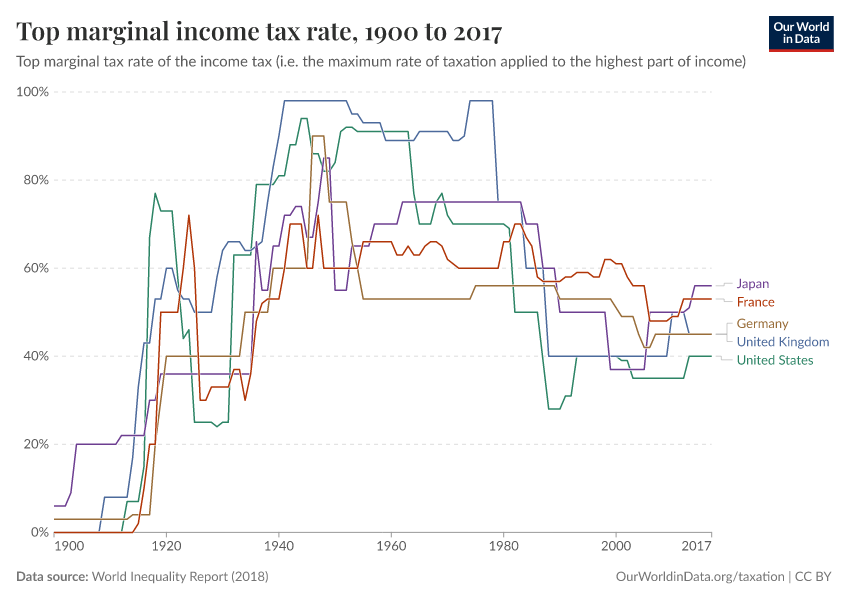 The chart here gives us an idea of how income taxation has changed in rich countries, by plotting trends in top marginal rates across France, Germany, the UK, the US, and Japan, over more than the last century.