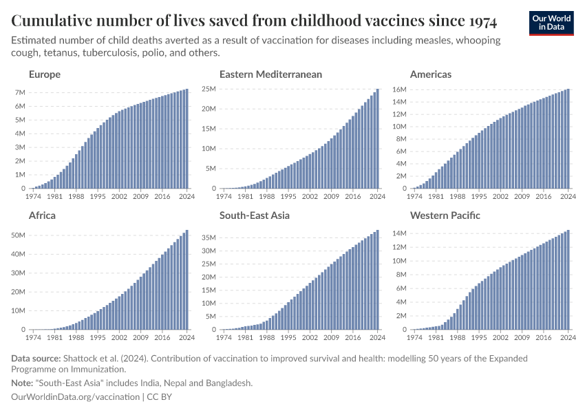 This has been a truly global effort, with more than 5 million children saved in every region, including over 50 million in Africa and 38 million in Southeast Asia. You can see the cumulative number of lives saved by WHO region in the chart below.