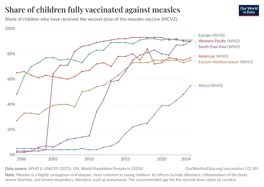 As the next chart shows, global vaccination against measles has increased from less than 20% in 2000 to over 70% today. Remember from earlier that vaccination against measles has saved the most lives.