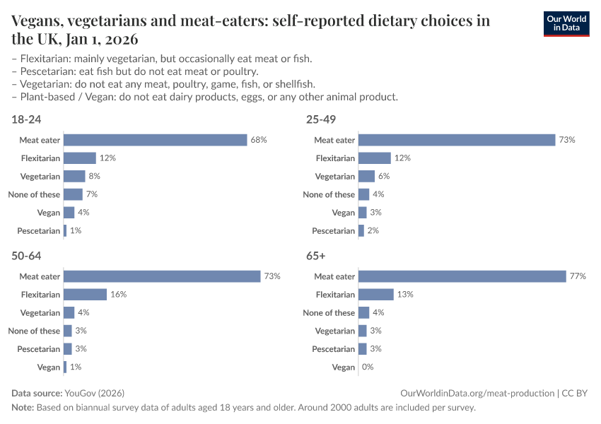 If we want to know about this variation we can rely on survey data on how people describe their dietary preferences. There is, unfortunately, a lack of long-term data on this. But we can look at recent developments.