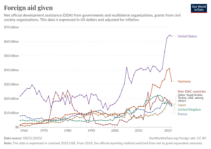 Simon van Teutem and Pablo Arriagada (2025) - “What is foreign aid? How “Official Development Assistance” is measured” Published online at OurWorldinData.org. Retrieved from: 'https://enhance-catalog-improvements.owid.pages.dev:8789/20260223-070107/what-is-foreign-aid.html' [Online Resource] (archived on February 23, 2026).BibTeX citation